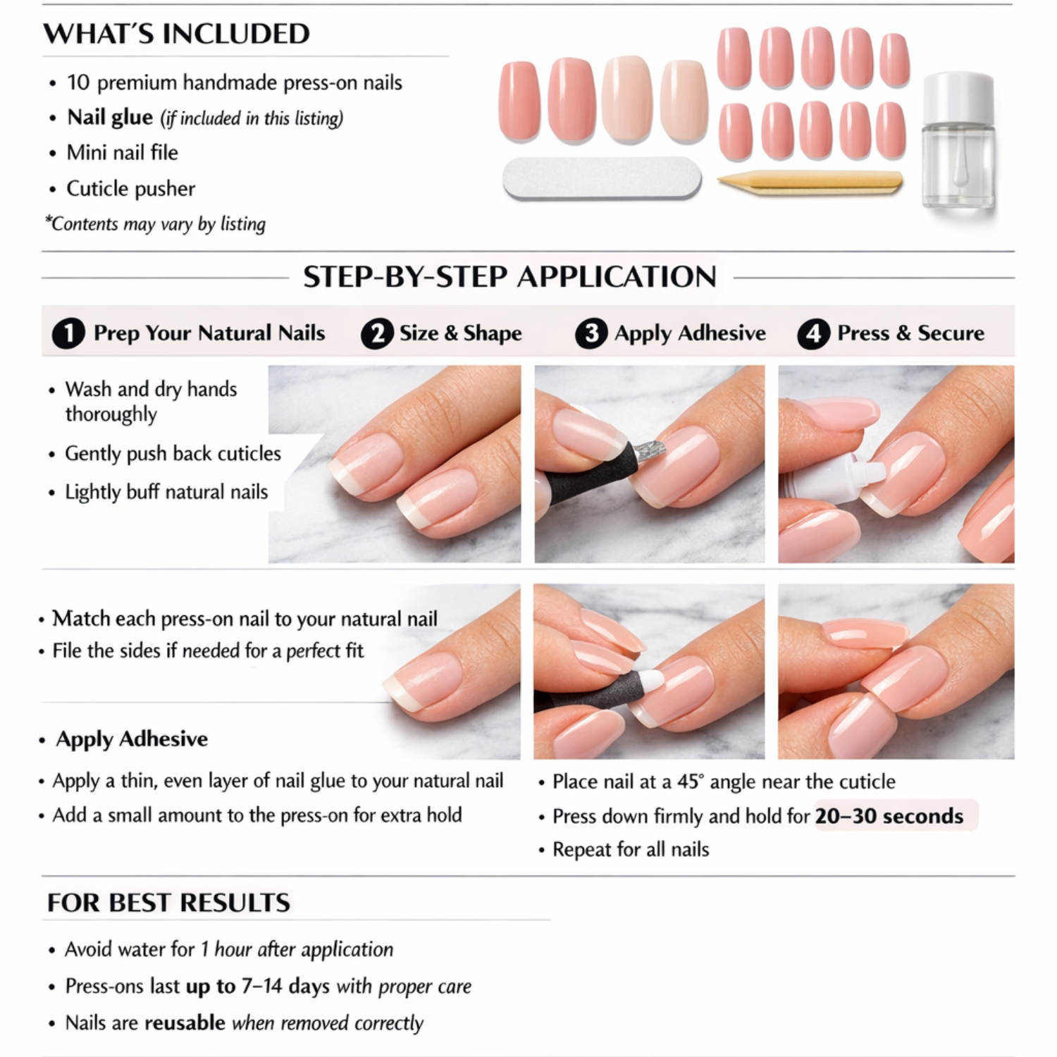All nail sets include a FREE Application Kit (cuticle pusher, 100/180 grit nail file, glue)