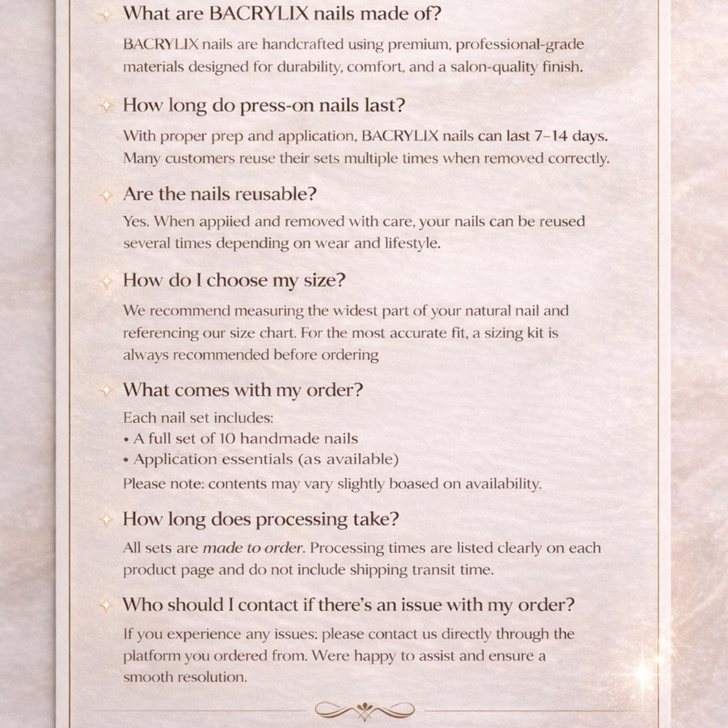 If you need your press ons by a certain date, please contact me bacrylix@gmail.com or use the chat feature below.